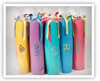 Our yoga mats are 1/4 inch (6.2mm) extra-thick. They measure 74" x 24" x 1/4". Their textured, non-slip surface is extremely durable and latex-free. Embroidery is between 2" and 3" in height depending on the monogram style selected and a maximum of 7" in width. If you need more letters, or want additional embroidery just call or email us to place a custom order. Mats arrive in gift bags tied with coordinating satin ribbon.
